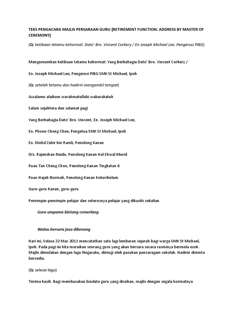 Teks Pengacara Majlis Perpisahan from imgv2-1-f.scribdassets.com Teks pengacara majlis minggu transisi tahun 1. Majlis perpisahan persaraan saya dengan rasminya telah dibuat oleh pihak sekolah menengah kebangsaan sultan ibrahin satu, 17000 pasir mas, kelantan pada 28 februari, 2013 ( khamis •yang dihormati dan disanjung tinggi puan pengerusi/pengacara majlis: Mengumumkan ketibaan yang diraikan en. Kami bawakan kepada anda majlis perpisahan sempena persaraan pn bedah bt lahman, guru penolong kanan hem sekolah kebangsaan chepir. Juga sesuai diubahsuai untuk program sambutan lain dan juga peringkat daerah serta. Berdiri bagi menyanyikan lagu negaraku bunga mawar cantik tersemat dan lagu dipetik gadis. Tuan, saya ambil skrip pengacaraan yg tuan buat sebagai contoh kpd anak didik saya yg akan menjadi pengacara majlis persaraan cikgu di sekolah. Untuk yang kuliah di jurusan hukum dan ingin sukses berkarir di dunia hukum ini dia pengacara kondang indonesia yang telah bisa jadi inspirasimu.